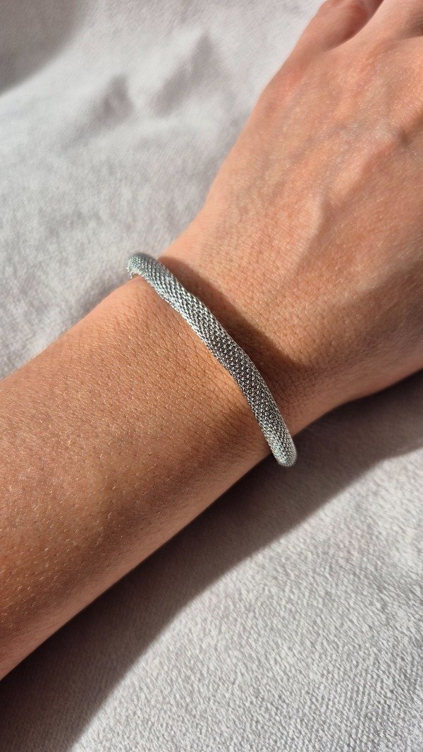 Elegancia y resistencia en un solo accesorio. Esta pulsera en acero quirúrgico combina un diseño tejido moderno con la calidad de un material duradero e hipoalergénico, ideal para el uso diario.